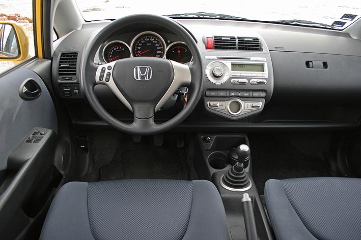 Και ξεκινάμε. Όταν περάσουμε στο εσωτερικό, το Jazz είναι αναμφισβήτητα ανώτερο. Τα υλικά του μοιάζουν τα καλύτερα της κατηγορίας, οπότε δείχνουν και καλύτερα από των Colt, Sirion. Αυτό χαρίζει μια αίσθηση μεγαλύτερου αυτοκινήτου. Επίσης έχει πολλές θήκες για μικροπράγματα. Η εργονομία όμως χρειάζεται μια μικρή περίοδο προσαρμογής. Από την άλλη, το Jazz έχει όμορφα όργανα και πολύ όμορφους χρωματισμούς όταν ανάβετε τα φώτα, ενώ τα «φιλέτα» αλουμινίου στην κεντρική κονσόλα είναι ευχάριστα.