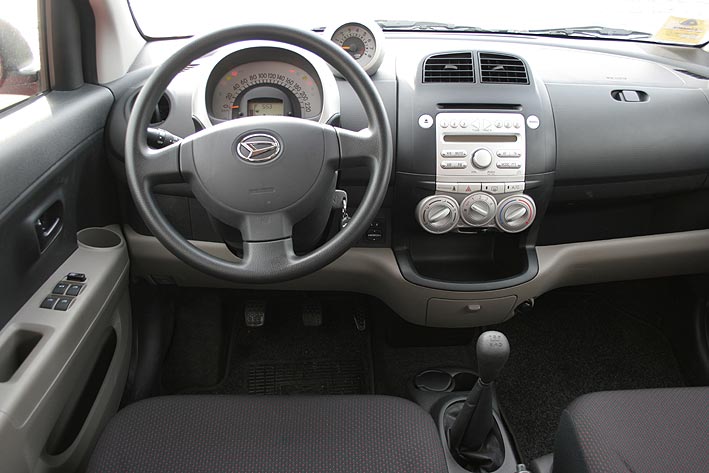 Το Sirion διαθέτει το πιο αφαιρετικό εσωτερικό, το πιο «καλλιτεχνικό». Το μικρό της Daihatsu έχει δε τους περισσότερους χώρους για μικροπράγματα από τα τρία μοντέλα. Όμως τα σκληρά πλαστικά δείχνουν τα πιο φθηνά, ενώ το μαύρο χρώμα τους δεν βοηθάει (μπορεί και λόγω όγκου της κεντρικής κονσόλας), σε αντίθεση με την επίσης κορυφαία συναρμογή (ας μην ξεχνάμε άλλωστε ότι και τα τρία αυτοκίνητα είναι ιαπωνικά).